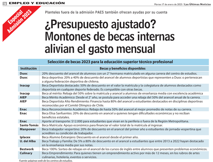 Además de los beneficios que entrega el Estado para estudiar -Gratuidad, becas Bicentenario o de Alimentación, entre otras- existe una serie de ayudas de las universidades, institutos y centros de formación técnica que imparten carreras que no piden como requisito de ingreso la Prueba de Acceso a la Educación Superior (PAES). “Muchos estudiantes de la educación técnico profesional compatibilizan estudios con trabajo, familia y gastos fijos, por lo que hacen un enorme esfuerzo para estudiar. Entregarles algún soporte financiero es tremendamente relevante y muy valorado”, destaca María José Gutierrez, gerente general de Grupo Educacional Enovus, que a través del Instituto Profesional Latinoamericano de Comercio Exterior (Iplacex) dicta carreras técnicas como Logística, Recursos Humanos, Farmacia, o profesionales como Auditoría, psicopedagogía entre otros.