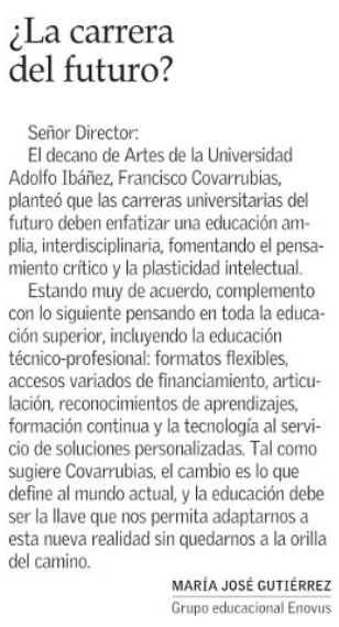 Nuestra Gerente General, María José Gutiérrez reflexionó en El Mercurio, sobre si las carreras universitarias del futuro deben enfatizar una educación amplia, interdisciplinaria, fomentando el pensamiento crítico y la plasticidad intelectual y como eso debe incluir a la Educación Técnico Profesional.